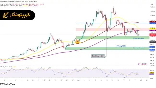 طبق آخرین تحلیل بازار ارز دیجیتال، تحلیل بایننس کوین 30 مهر 1404 نشون میده که این ارز دیجیتال این هفته در روز چهارشنبه کمی افت کرد و طی هفت روز گذشته حدود ۱۰ درصد از ارزشش رو از دست داد و الان حوالی ۱۰۷۲ دلار معامله میشه. چندین شاخص تکنیکال و درون زنجیرهای نشون میدن که حمایت ۱۰۰۰ دلاری یه خط دفاعی خیلی مهم برای خریداران هست و اگر این سطح حفظ نشه، احتمال ریزش تا حدود ۸۴۵ دلار وجود داره.