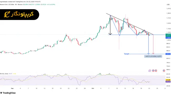 در روند نزولی، اولین محدوده حمایتی بین کف روز سهشنبه یعنی ۱۰۵۰ دلار و پایینترین سطح کوتاه مدت ۱۵ اکتبر در ۱۰۲۰ دلار قرار داره. خط دفاع بعدی سطح روانی ۱۰۰۰ دلار هست که از ۳۰ سپتامبر 2025 به عنوان حمایت عمل کرده. اگر قیمت زیر ۱۰۰۰ دلار بسته بشه، احتمال افت بیشتر تا محدوده ۹۵۵ تا ۹۳۰ دلار و حتی کف شمعی که در ۱۱ اکتبر تشکیل شد در ۸۷۴ دلار وجود داره. نمودار ششساعته هم نشون میده بایننس کوین از یک مثلث نزولی خارج شده و اگر نتونه بالای خط حمایت ۱۰۶۹ دلار بسته بشه، مسیر نزولی تا ۸۴۵ دلار ادامه پیدا میکنه و زیان کل به ۲۱٪ میرسه.