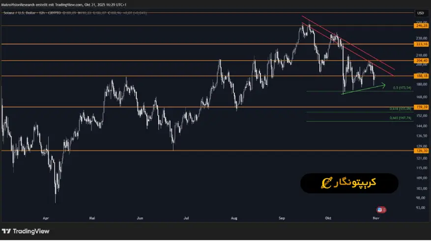 طبق تحلیل سولانا ۱۰ آبان ۱۴۰۴، از نظر تکنیکال محدودهی ۱۷۳ تا ۱۸۰ دلار یه حمایت مهم برای سولانا حساب میشه. این محدوده با سطح فیبوناچی ۰.۵ همراستاست و جاییه که معمولا خریدارها وارد بازار میشن. اگه این سطح از دست بره، ممکنه قیمت تا محدودهی ۱۵۵ تا ۱۴۸ دلار بریزه؛ این محدوده با سطوح ۰.۶۱۸ تا ۰.۶۶۵ فیبوناچی همخوانی داره و طبق داده های گذشته قیمت دوباره ازش برمیگرده و یه حرکت صعودی جدید شروع میکنه.