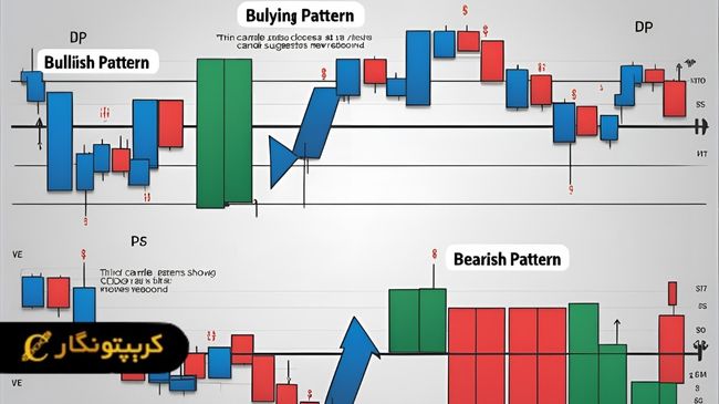 بازار واقعی همیشه نظم کتابی ندارد. برای همین شناخت تفاوت الگوهای صعودی و نزولی ضروری است. در الگوی صعودی، فشار خرید غالب است و کندل سوم در کف تازهای بسته میشود. این وضعیت احتمال جهش قیمت را بالا میبرد. در نقطه مقابل، بالا بودن کندل سوم از دو کندل کناری سیگنال ضعف خریداران و شروع موج نزولی را میدهد. ترکیب الگو با میانگین متحرک یا حجم، دقت تحلیل را بیشتر میکند و از سیگنال کاذب میکاهد.