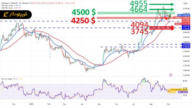 از طرف دیگر، اگر قیمت به روند نزولی خود ادامه دهد و به زیر ۴۲۵۰ دلار سقوط کند، این جفت ارز میتواند تا سطح شکست ۴۰۹۴ دلار سقوط کند. انتظار میرود خریداران به شدت از سطح ۴۰۹۴ دلار دفاع کنند؛ زیرا شکست آن ممکن است قیمت اتر را به ۳۷۴۵ دلار کاهش دهد.