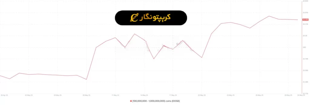 طبق دادههای زنجیرهای، کیف پولهایی که بین ۱۰۰ میلیون تا ۱ میلیارد دوج کوین نگهداری میکردند، در دو روز اخیر موجودی خود را از ۲۶.۵۵ میلیارد به ۲۶.۴۹ میلیارد کاهش دادهاند. این رفتار نشاندهنده کاهش اعتماد نهنگها به ادامه روند صعودی در کوتاهمدت است. نهنگها معمولاً در زمان کاهش قیمت اقدام به فروش میکنند و هنگام نزدیک شدن به شروع روند صعودی، مجدداً خرید میکنند.