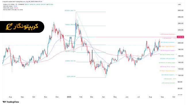 نمودار روزانه نشان میدهد سولانا پس از سقوط به 93.35 دلار در آوریل، وارد روند صعودی شده و در 22 جولای الگوی تقاطع طلایی (Golden Cross تقاطع صعودی میانگینهای 50 و 200 روزه) را تشکیل داده است. در حال حاضر، قیمت نزدیک سطح مقاومتی فیبوناچی 61.8 درصد قرار دارد. عبور از این مقاومت میتواند مسیر رشد تا اوج تاریخی 295 دلار را باز کند که معادل 55 درصد بالاتر از سطح فعلی است.