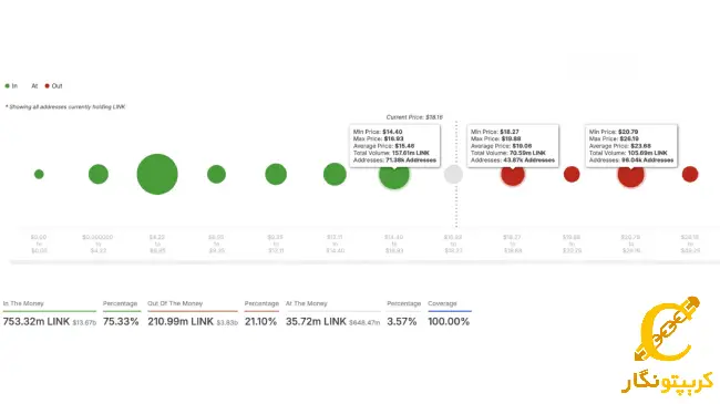 طبق دادههای IntoTheBlock، اکثر معاملهگرانی که در ضرر هستند، در محدودهی قیمتی ۲۰ تا ۲۶ دلار خرید انجام دادهاند. بهخصوص، ۴۳,۰۰۰ معاملهگر حدود ۷۰ میلیون LINK را بین ۱۸.۲۷ تا ۱۹.۸۸ دلار خریداری کردهاند که این سطح بهعنوان یک مقاومت فوری عمل میکند.