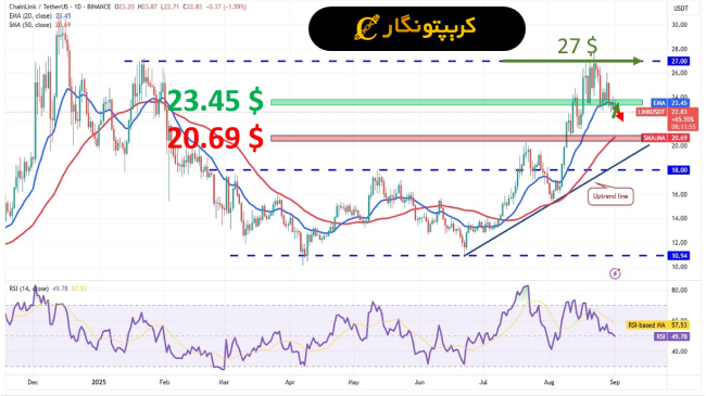 چین لینک پس از افت به زیر میانگین متحرک ۲۰ روزه با فشار فروشندگان مواجه شده و احتمال افت بیشتر تا محدوده ۲۱.۳۶ و ۲۰.۶۹ دلار وجود دارد. با این حال، دفاع خریداران از میانگین متحرک ۵۰ روزه میتواند مانع ریزش عمیقتر شود. بازگشت قیمت به بالای ۲۳.۴۵ دلار اولین نشانه قدرت خریداران خواهد بود و در صورت عبور از مقاومت ۲۷ دلار، روند صعودی میتواند از سر گرفته شود.
