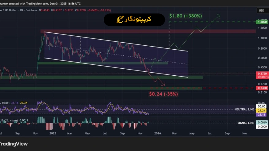 اگر کانال نزولی شکسته بشه، ADA ممکنه حدود ۳۵ درصد دیگه کاهش پیدا کنه و سطح حمایت مهم ۰.۲۴ دلار هم شکسته بشه؛ سطحی که تا حالا یه کف محکم بوده. بر اساس تحلیل کاردانو ۱۱ آذر ۱۴۰۴، در صورتی که محرکی برای افزایش تقاضا مانند تأیید ETF اسپات یا شرایط کلان اقتصادی مساعد، مانند کاهش نرخ بهره در آمریکا در دسامبر 2025 رخ بده، دوباره سناریوی صعودی برجسته میشه.