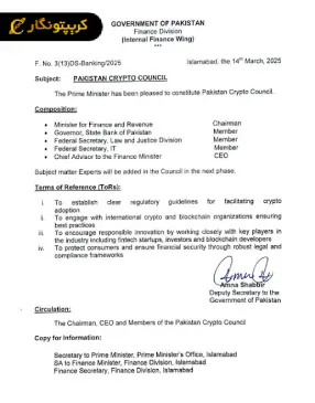 با این حال، در فوریه ۲۰۲۵ وزارت دارایی پاکستان با تشکیل «شورای رمزارز پاکستان» گام بلندی بهسوی پذیرش رسمی رمزارزها برداشت. هدف از تشکیل این شورا، تدوین قوانین شفاف برای فعالیت در حوزه رمزارز و جذب سرمایهگذاری خارجی اعلام شده است.