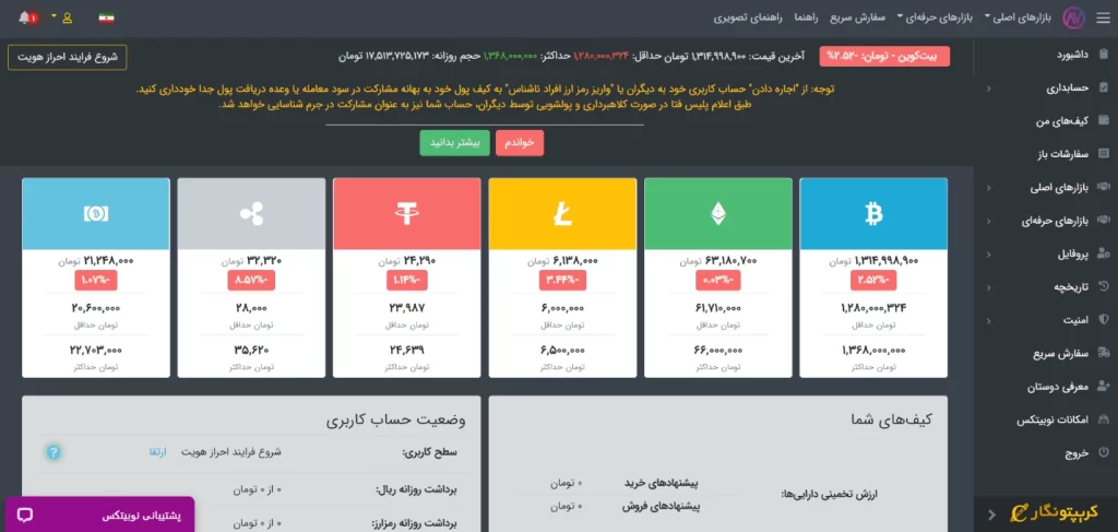 بعد از اینکه در صرافی نوبیتکس ثبت نام کردید وارد محیط کاربری میشوید و همانند تصویر، صفحهای که در ابتدا برای شما باز میشود گزینه داشبورد است. همچنین در منوی کشویی که در سمت راست سایت قرار دارد بخشهای مختلف دیگری وجود دارد که در ادامه به آنها میپردازیم.